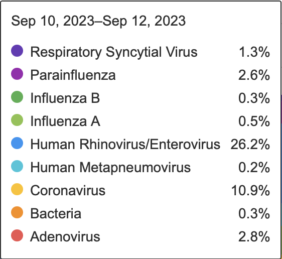 Wastewater surveillance and ED visits/hospitalizations, as well as recent testing data information from Biofire to get a sense of what is going around: the majority of respiratory symptoms right now are due to either Covid-19, Rhinovirus (the common cold) or Enterovirus (a cause of Hand, Foot & Mouth; source).